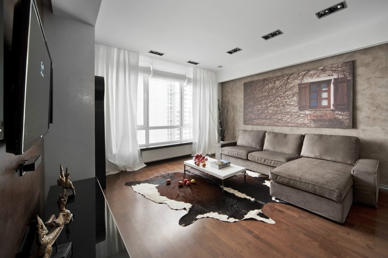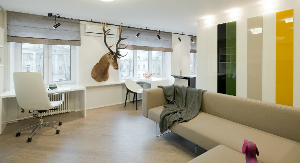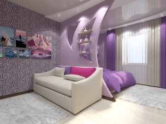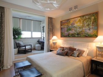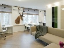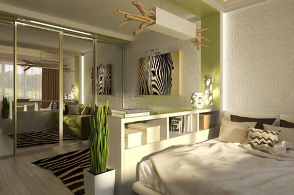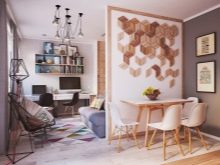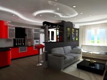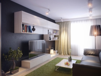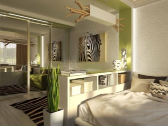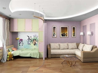 In einem Apartment mit einem Schlafzimmer können Sie das Wohnzimmer mit einem Schlafzimmer oder einem Kinderzimmer kombinieren. Es ist notwendig, dunkle und zu helle Farbtöne zu vermeiden. Die strukturelle Decke hilft beim Zonenplan.