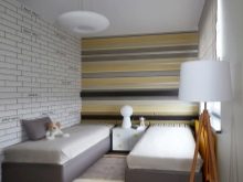 - Eine andere Lösung ist die Verwendung von Tapeten mit horizontalen Mustern an kurzen Wänden. Die Leinwände werden sie ausstrecken und den Raum harmonisch wirken lassen.
