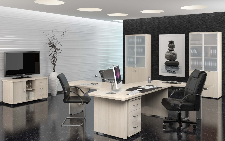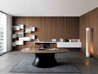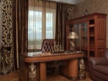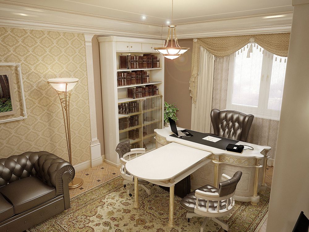 Die englischen Klassiker mit Holzmöbeln aus teuren Rassen oder hellem High-Tech passen gut in einen separaten Arbeitsraum. Neben Regalen für Dokumente und dem Desktop ist es möglich, die Heimbibliothek im Büro auszustatten.