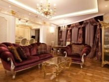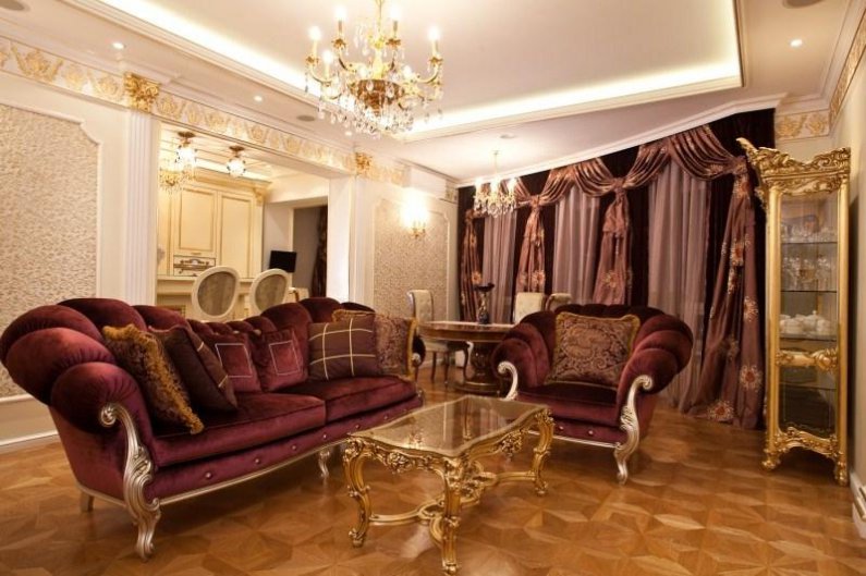 Bei großen Räumlichkeiten sollte darauf geachtet werden klassischer Stil. Massive Möbel, eine Fülle von Vergoldungen, Stuck an den Decken, teure Stoffe, die Farbpalette der tiefen Töne wird einen einzigartigen Komfort und Chic geben. Barock ist für Liebhaber von Luxus und Raffinesse geeignet. Gesättigte Kastanienbraun, Smaragd, Schokotöne in Kombination mit Goldguss-Accessoires lassen niemanden gleichgültig.
