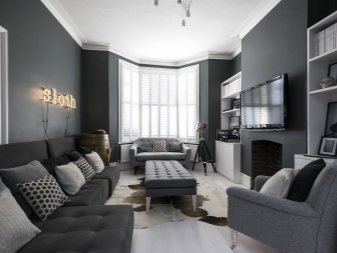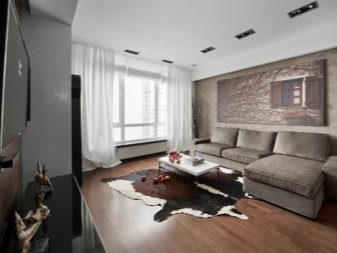 Es gibt Zimmer mit L-Form. Dies kann auch in eine Tugend verwandelt werden. Eine Wendung im Raum deutet auf Zoneneinteilung hin. Wenn es die Fläche erlaubt, kann der kleinere Teil zum Büro oder zum Essbereich werden. Auf einer größeren Fläche können Sie ein Sofa und Stühle mit einem Couchtisch arrangieren.