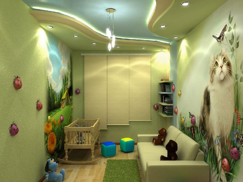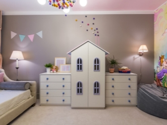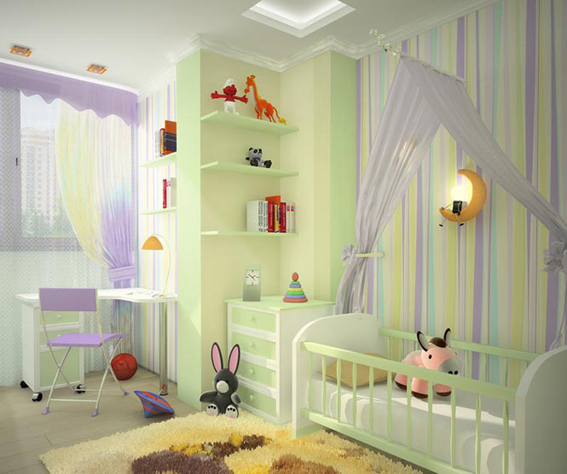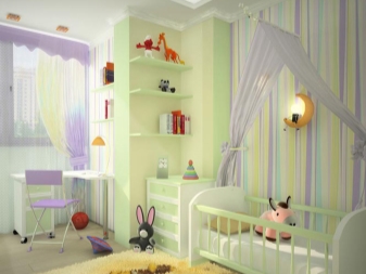 In diesem Fall berücksichtigt der Designer nicht nur das Geschlecht, sondern auch das Alter des Kindes. Für Babys geeignet zarte Innenräume, Tapeten mit einem niedlichen Muster und leichte Textilien. Möbel sind besser, einfach und funktional zu wählen, um den Raum nicht zu überladen, da es im Leben eines Kindes viele Spielsachen, Bücher und Objekte für Kreativität gibt. Der Auftrag wird gekonnt mit Regalen, Schubladen und Regalen organisiert. Für kleine Räume gibt es viele vorgefertigte Sets von kompakten Möbeln und Transformatorensets.