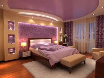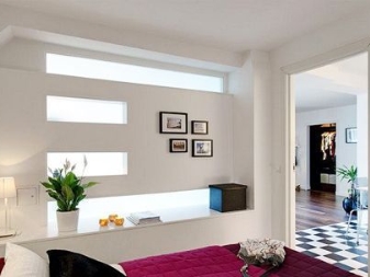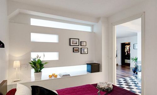 - Wenn das Schlafzimmer durch eine Trennwand vom Rest der Wohnung getrennt ist, ist es besser, es aus transparentem oder mattem Glas oder Kunststoff zu machen. Zusätzliche Strahlen können die Trennwand in Teile zerlegen und Fensteröffnungen simulieren.