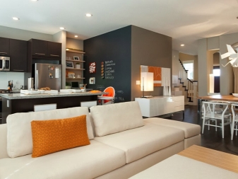 Um den Kontrast des Übergangs von einer Zone zur anderen zu minimieren, können Sie die Eckmöbel - ein Sofa oder eine Wand - verwenden. So wird das Innere in beiden Teilen des Raumes sein. Diese Anordnung wird harmonischer sein.