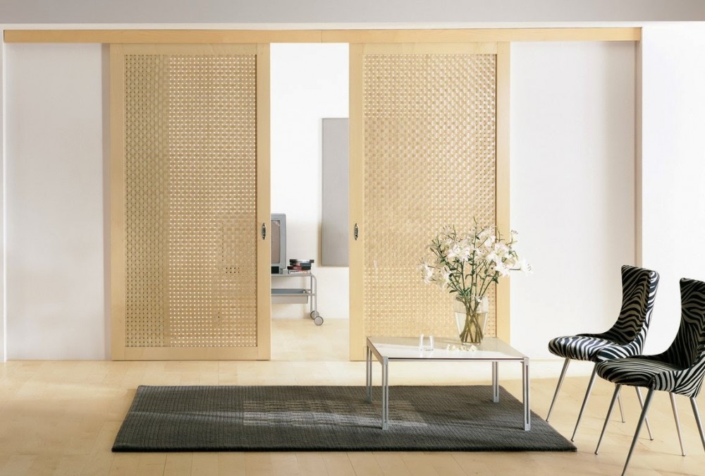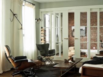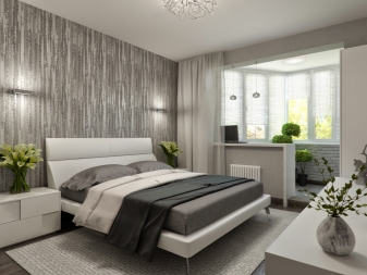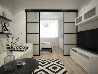 - Türen aus dem Wohnzimmer sollten sich zum Schlafzimmer öffnen, um den Raum des Gemeinschaftsraums nicht zu überladen. Verwenden Sie besser Gleitoptionen. Sie werden Platz in beiden Räumen sparen.