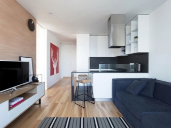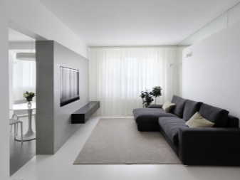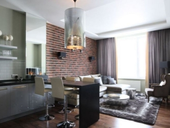 In großformatigen, rechteckigen Wohnräumen kann die Zonierung mit Gipskartonplatten, Glas-, Kunststoff- und Spanplattentrennwänden, Papier- und Textilauflagen erfolgen. Das Schlafzimmer kann mit Hilfe von weichen durchsichtigen Vorhängen vom Wohnzimmer getrennt werden. Kitchen Set erfolgreich isoliert die Bar.