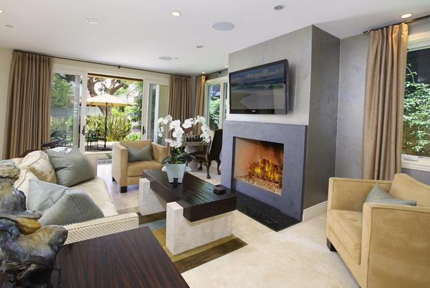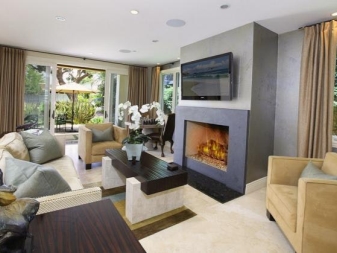 - Kamin. Im Falle eines begrenzten Budgets gibt es viele Möglichkeiten: Nachahmung auf der Fototapete, Elektro- und Biokamine, verschiedene Leuchten.