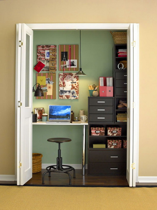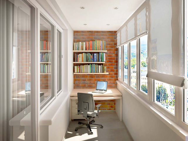 In älteren Wohnungen werden Lagerräume mit einer Größe von 2 x 2 Metern oder weniger in ein Büro umgewandelt, in dem Sie einen Computer oder einen Schreibtisch und Schubladen und Regale für die Aufbewahrung von Dokumenten platzieren müssen, sowie über ein effizientes Beleuchtungssystem nachdenken.