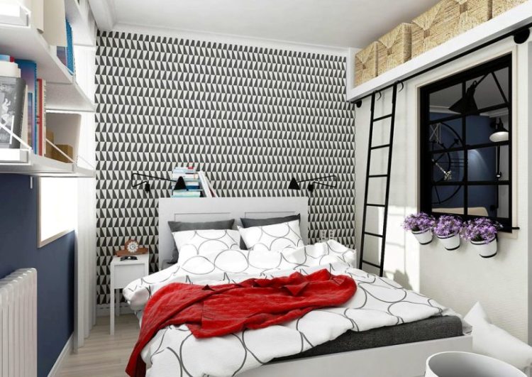 Wenn Sie ein Fünf-Meter-Zimmer zur Verfügung haben, das unter dem Schlafzimmer ausgestattet werden muss, dann ist die Hauptsache, das Bett und das Speichersystem unterzubringen. Hier sind mögliche Optionen: