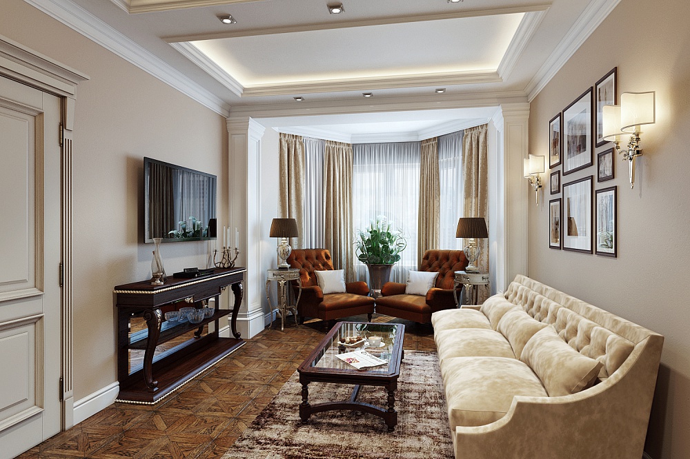Für einen rechteckigen Raum lohnt es sich, ein zentrales großes Objekt zu wählen, um das sich das gesamte Design gruppieren wird. Es kann eine Wand, ein großer Fernseher oder ein Sofa sein. Wenn die Raumfläche es erlaubt, können Sie es in Zonen aufteilen: Esszimmer, Erholungsgebiet, Arbeit und Studium.