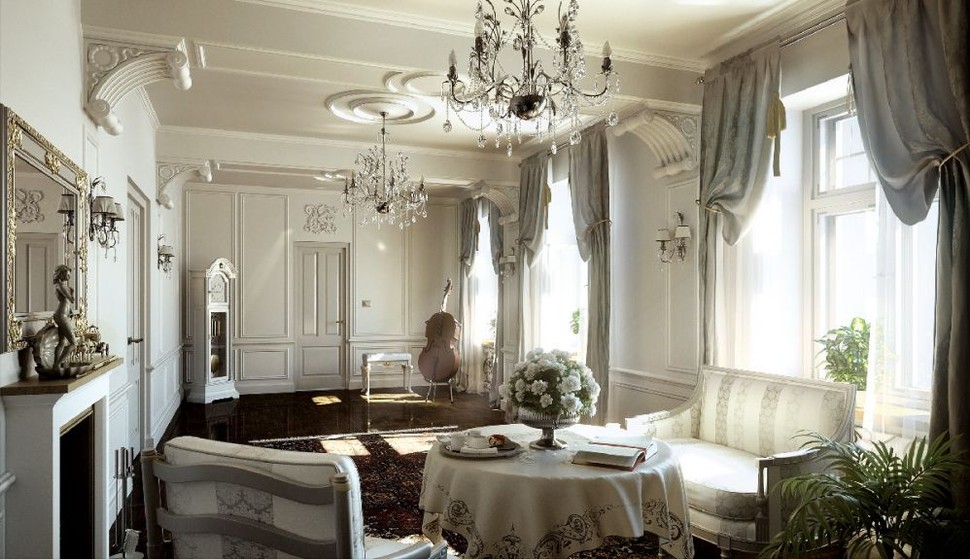 Mehr ruhige Design haben Stile Rokoko und Reich. Pastellfarben und gemusterte Bilderrahmen, Spiegel und weiche Umrisse von Möbeln verleihen dem Dekor einen Hauch von Romantik.
