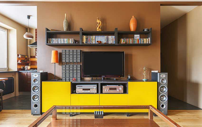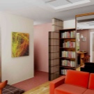 - Sie können ein Zwei-Zimmer- "Chruschtschow" geräumig machen, indem Sie zwischen den Räumen ein funktionelles Trockenwandregal installieren. Aufgrund der Tatsache, dass diese räumliche Lösung keine tauben Trennwände vorsieht, gibt es keine klaren Grenzen zwischen den Räumen, wodurch es möglich ist, alle Bereiche der Wohnung als Ganzes wahrzunehmen. Die Gestaltung der Zimmer ist in Weiß gehalten. Dies macht die Wohnung geräumig und luftig. Helle Farbakzente verleihen dem Interieur ein dynamisches Aussehen.