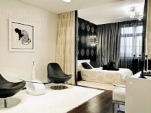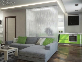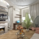 - Transluzente bewegliche Partition ermöglicht Ihnen auch, einen Raum von einem anderen zu trennen. Bei Bedarf kann es geschlossen werden, und im Freien stört es nicht, beide Räume als einen einzigen großen Raum wahrzunehmen, und macht es möglich, sich nicht eingeengt zu fühlen. Dies trägt auch zur einfachen Gestaltung der Decke und der Möbel bei, ohne übermäßige Pomp und volumetrische Details.