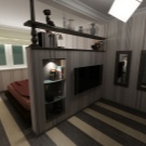 Zur gleichen Zeit wird der kleine Raum durch Verschieben der Trennwand um 15 cm breiter. Dann sind ein komfortables Schlafzimmer und ein Kleiderschrank darin angeordnet. Vom großen Raum mit einer transparenten Wand hebt sich ein Miniaturbüro ab. Schiebetüren erlauben, wenn notwendig, diesen Bereich in den gemeinsamen Raum des Wohnzimmers einzuschließen.