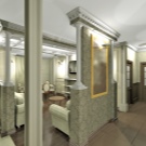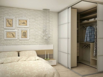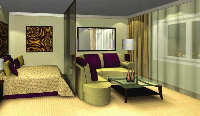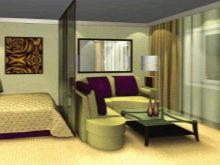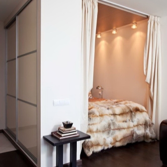 Ein solches Schlafzimmer als Ergebnis der Sanierung kann sogar ohne Fenster sein.Aber dank der hochwertigen Beleuchtung und anderer Designtricks kann auch in dieser Version sehr komfortabel gearbeitet werden. Wenn eine wesentliche Vergrößerung des Wohnzimmers nicht erforderlich ist, wird eine Trennwand zwischen dem Schlafzimmer und der Halle abgerissen, die durch dekorative Säulen ersetzt wird. Der Schlafbereich ist gleichzeitig mit schweren Vorhängen vor neugierigen Blicken isoliert.