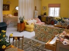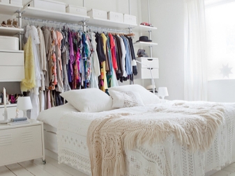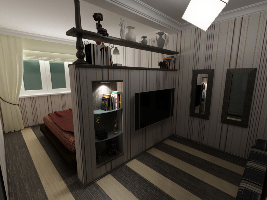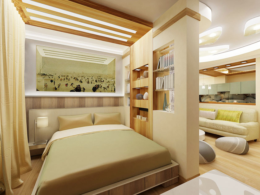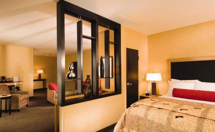 - So wird anstelle einer leeren Wand eine dekorative Struktur zwischen den Räumen installiert, die an einen Fensterrahmen erinnert, der auch als Ablage für Vasen dient. Mit dieser Bewegung können Sie den Schlafbereich vom Wohnzimmer trennen. Neben dem Bett führt eine Tür in die Speisekammer oder den Kleiderschrank. Somit bleibt der Raum funktionsfähig. Seine Offenheit ermöglicht es Ihnen, ein Gefühl von Geräumigkeit zu bewahren.