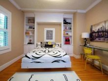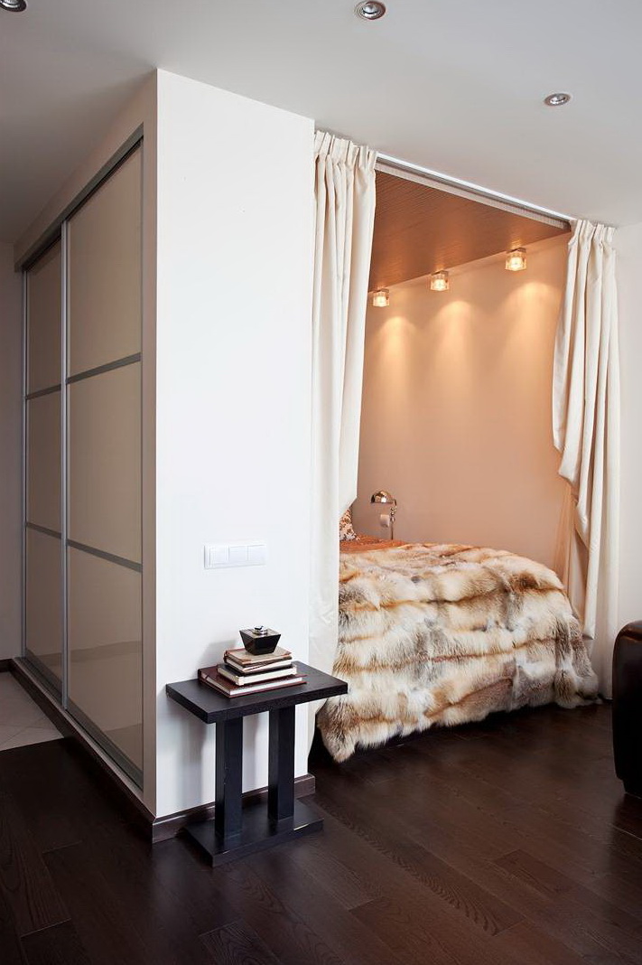 - Die Zuweisung eines speziellen Platzes für ein Bett auf ein Minimum reduziert die Fläche des Schlafzimmers. So ist es möglich, den größten Teil der Wohnung für andere Funktionen freizugeben, und die Besitzer haben eine kleine gemütliche Ecke, die vor neugierigen Blicken verborgen ist, so dass sie sich in ihre eigene, intime Welt zurückziehen können.