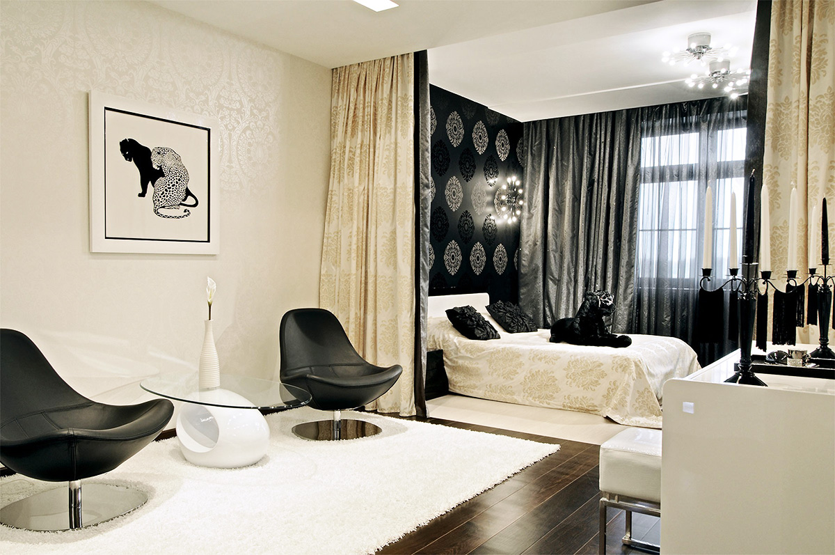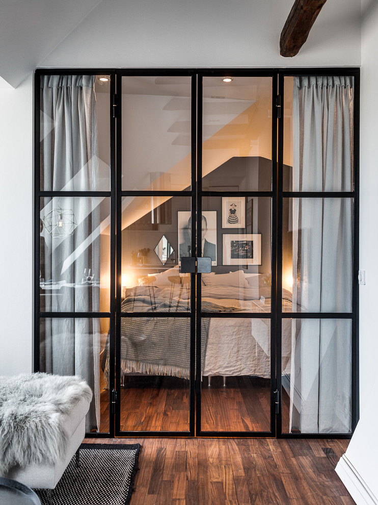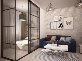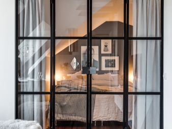 - Die Grenze zwischen dem Wohnzimmer und dem Schlafzimmer kann mit einer Glastrennwand mit einer Tür markiert werden.Die Verwendung von schwarzen Rahmen im Design macht diese Lösung interessant und füllt den Raum mit Gemütlichkeit. Es war, als ob ein anderes großes Fenster auf dem Boden in der Wohnung erschien. Dass das Schlafzimmer nicht immer in Sichtweite war, sind an einer Trennwand Vorhänge vorgesehen.
