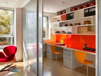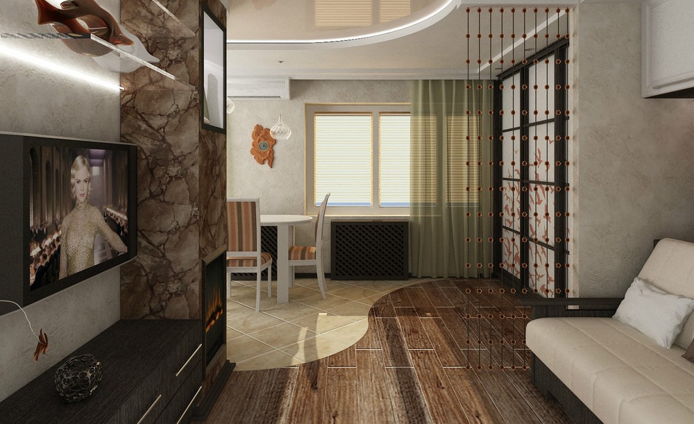 Wer zu Hause arbeitet, wird die Sanierungsprojekte eines Zweizimmerhauses "Chruschtschow" mit einem Bürobereich zu schätzen wissen. In dieser Art von Wohnzimmer, zum Beispiel, erhöht sich durch die Kombination mit einem Flur und Küche. Dies schafft einen komfortablen Raum für Freizeit und Essen.