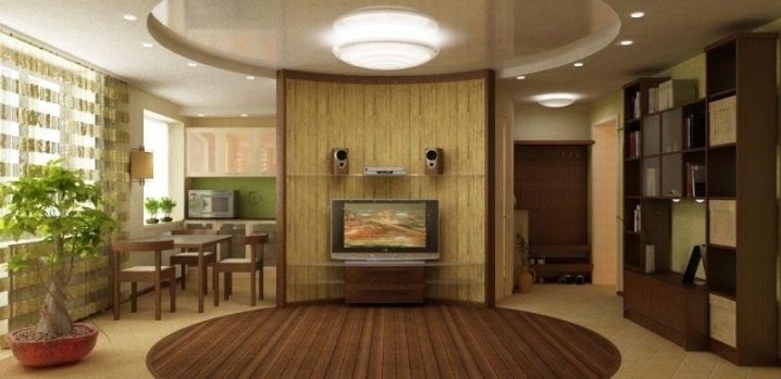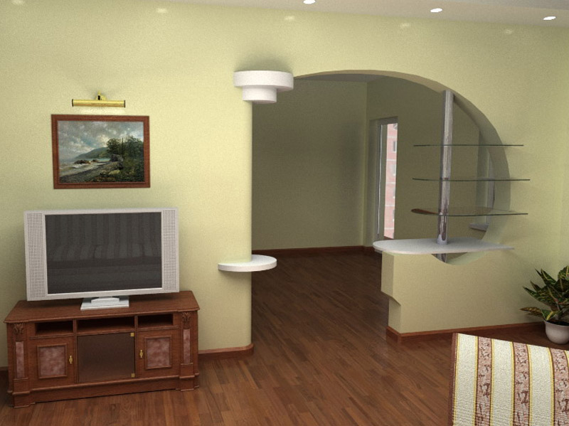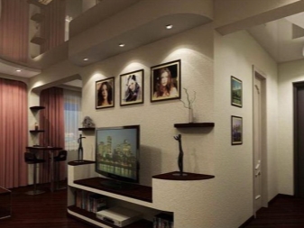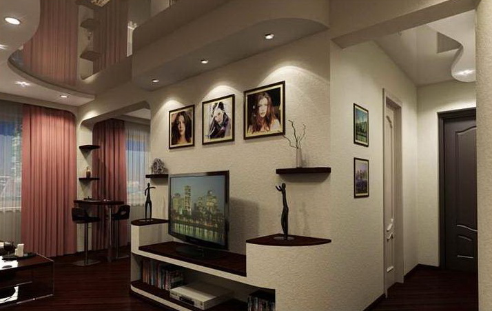- Assistent bei der Schaffung einer geräumigen Wohnung wird die Verwendung von Strukturen aus Gipskartonplatten, dekorative Nischen, Regale und Regale sein.