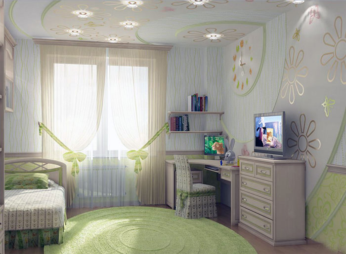 - Fußböden sollten in hellen Farben dekoriert sein, um dem Gesamtfarbschema zu entsprechen.