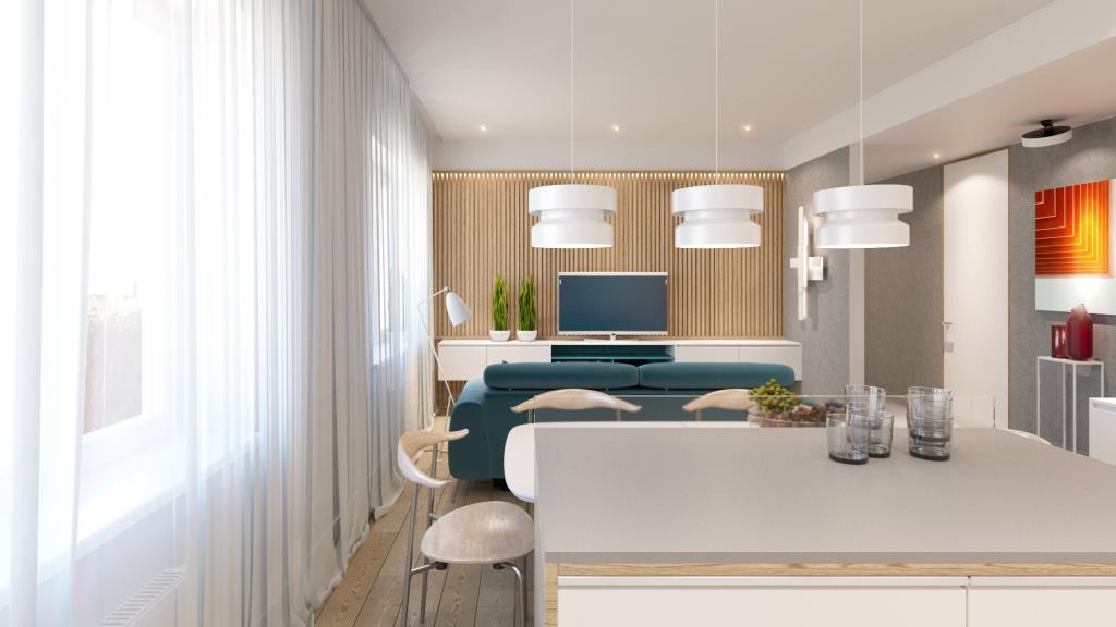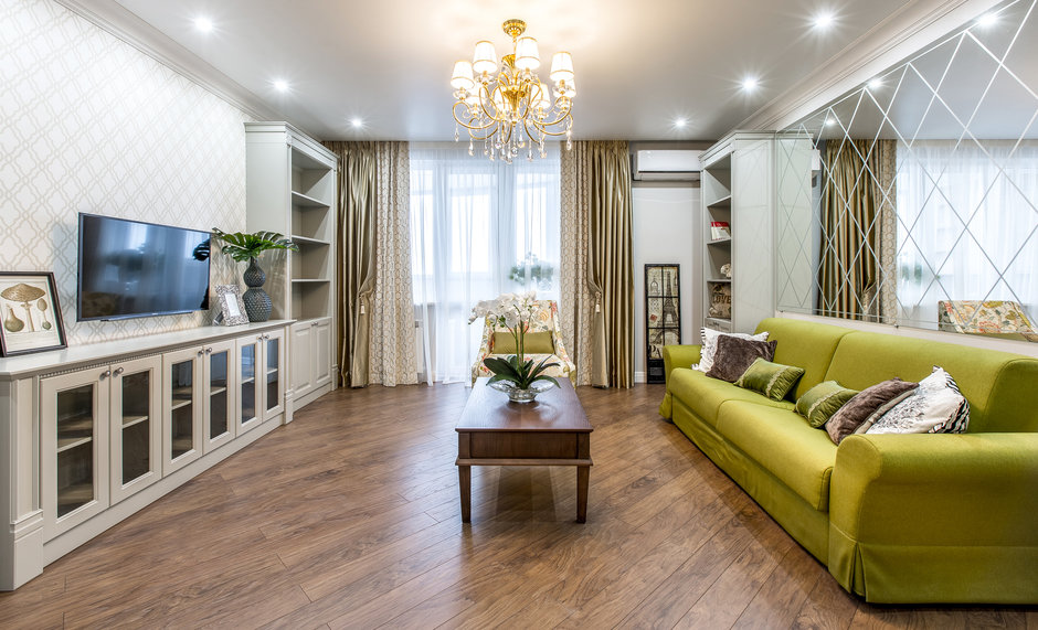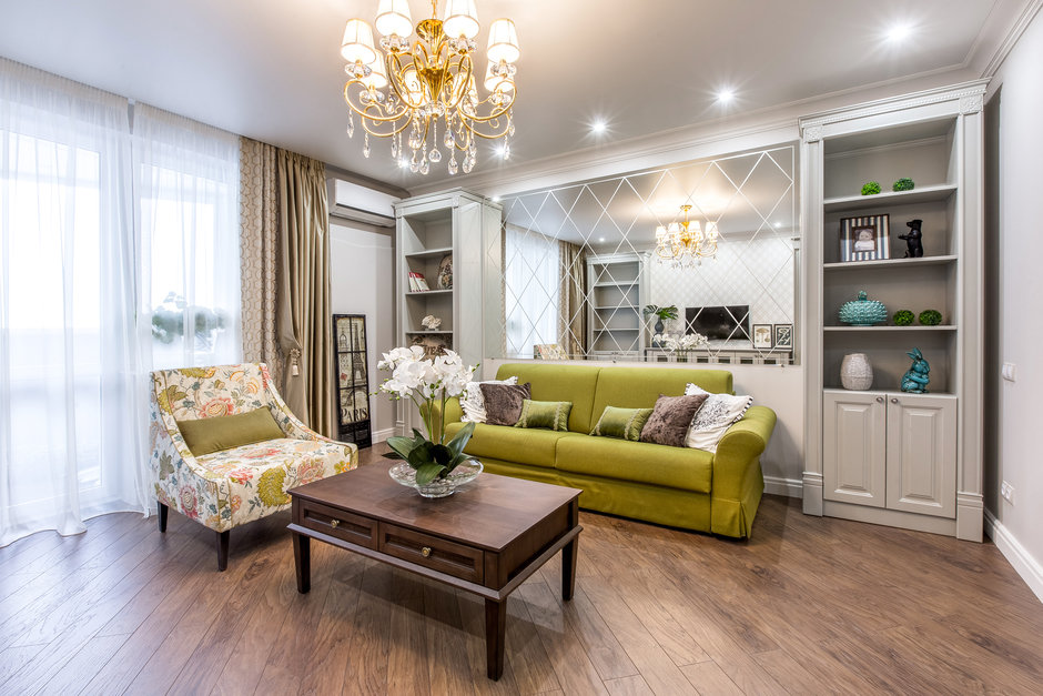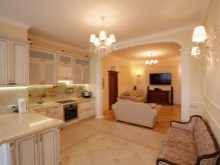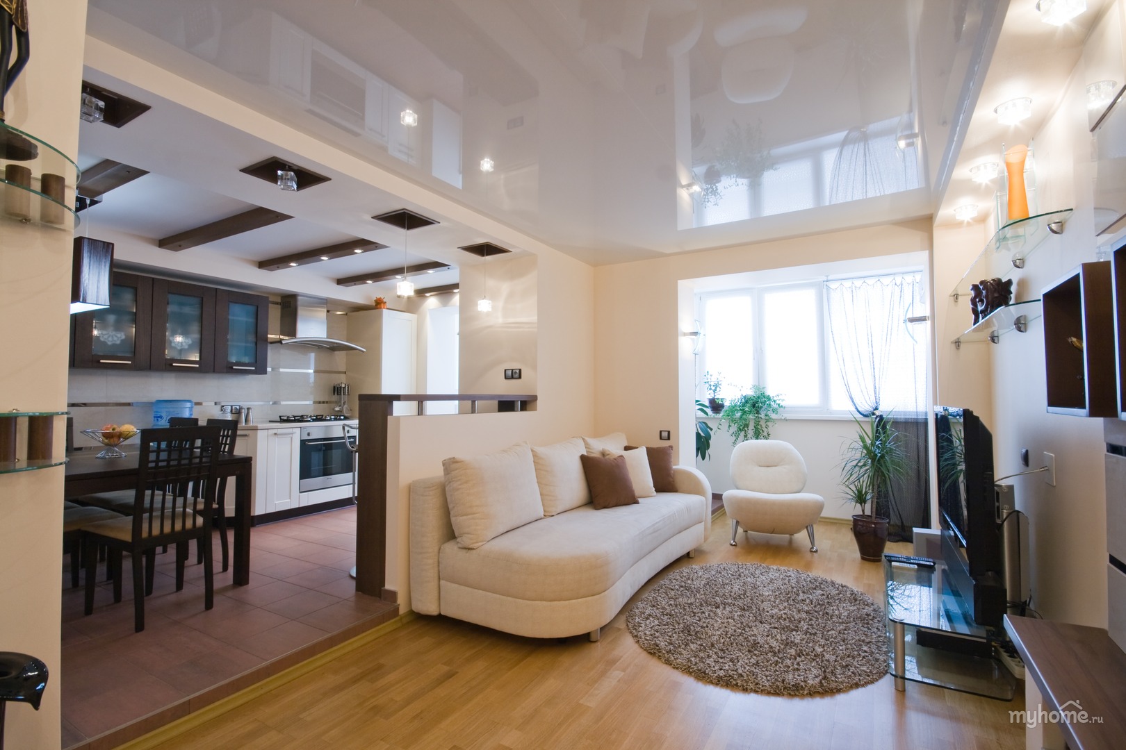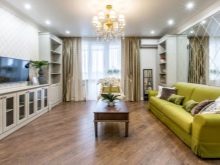 Auch eine teilweise Vereinigung der Räumlichkeiten, zum Beispiel ein Balkon mit einem Schlafzimmer oder eine Küche mit einem Wohnzimmer. Der Boden in einer solchen Wohnung wird durch Fliesen ersetzt und der alte Holzboden und die Estriche entfernt.