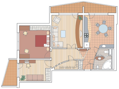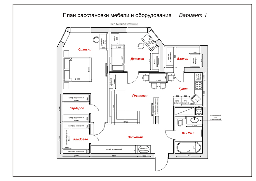 Im Allgemeinen ein ziemlich erfolgreiches und modernes Layout für eine Familie von drei oder vier Personen.