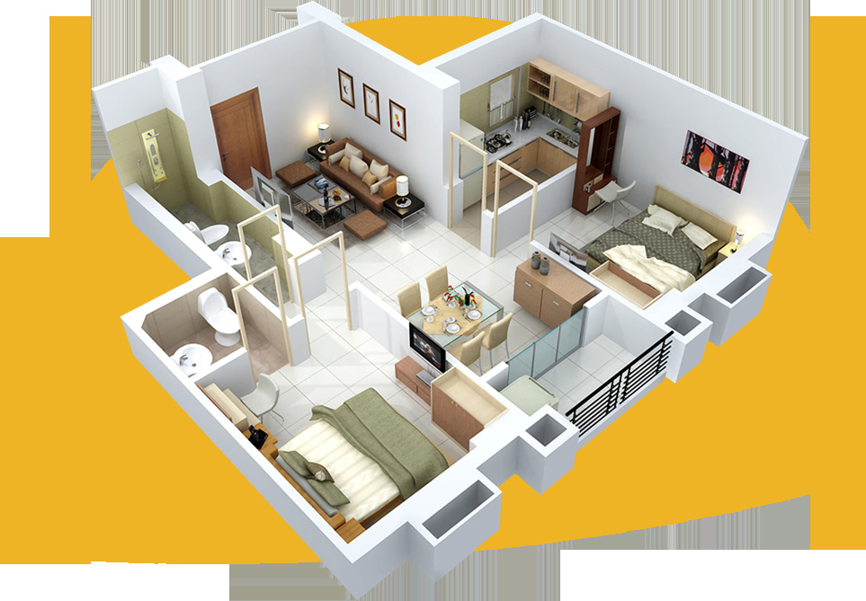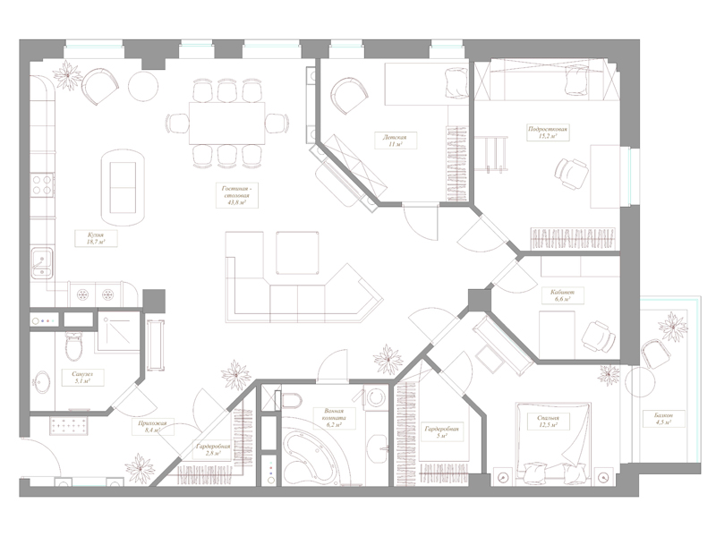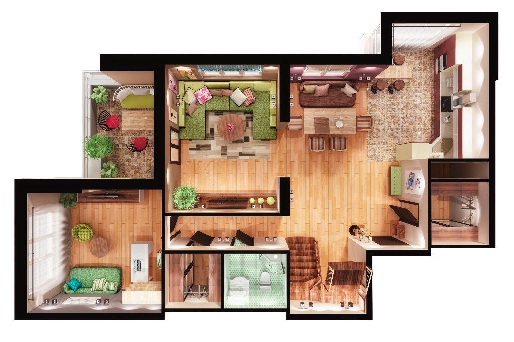 Die Pläne von Drei-Zimmer-Business-Class-Apartments können hohe Decken sowie mehrere Badezimmer umfassen. Natürlich ist die Gesamtfläche einer solchen Wohnung auch größer als üblich.