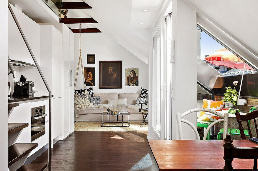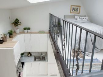 Es gibt viele ungewöhnliche Lösungen, um die nutzbare Fläche zu erweitern. Viele Leute kaufen eine Wohnung auf dem Dachboden und gleichzeitig eine Wohnung direkt darunter und rüsten ein zweistöckiges Haus mit Zugang zum Dach aus. Andere rüsten solche zweistöckigen Wohnungen in hohen, spitzen Dachgeschossen aus, wobei der "zweite Stock" nur ein kleiner Raum sein kann.