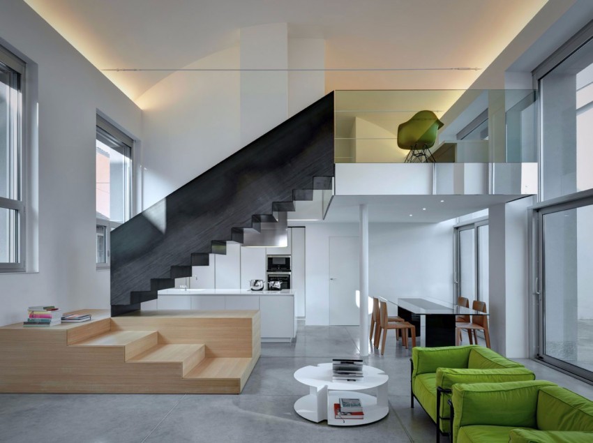 Die Kombination von High-Tech mit Minimalismus und viel natürlichem Licht wird dem Dachboden ein Gefühl von Raffinesse und Luxus geben, und die Fülle von Glas wird nur die Durchdringung mit dem Himmel betonen.