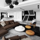 Dieser Stil passt nicht in den Raum zufälliger Dinge. Alles unterliegt der Bequemlichkeit und betont den Umfang und die Errungenschaften neuer Technologien.Die Wände sind im Stil oft monophon, bemalt oder tapeziert in Grau, Beigetönen oder mit einem metallischen Glanz. Decke nachgeahmt Balken, Möbel aus Glas, Edelstahl und Kunststoff - wichtige Designelemente.