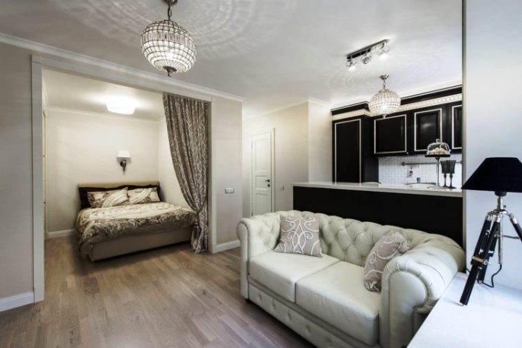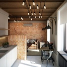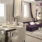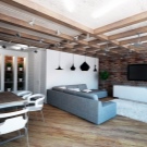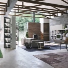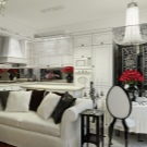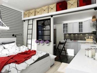 Dies ist eine Interpretation der eigenartigen Studiosituation der kreativen Gesellschaftsschicht, die sich durch die Großzügigkeit und Atmosphäre kreativer Unordnung auszeichnet. In solchen Wohnungen gibt es keinen Balkon oder Loggia, die Küche befindet sich in der Nähe des Eingangs, die Gäste- (oder Schlaf-) Zone befindet sich in der Nähe des Fensters.