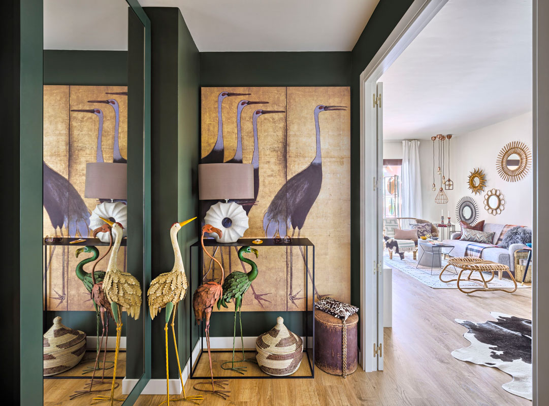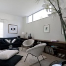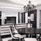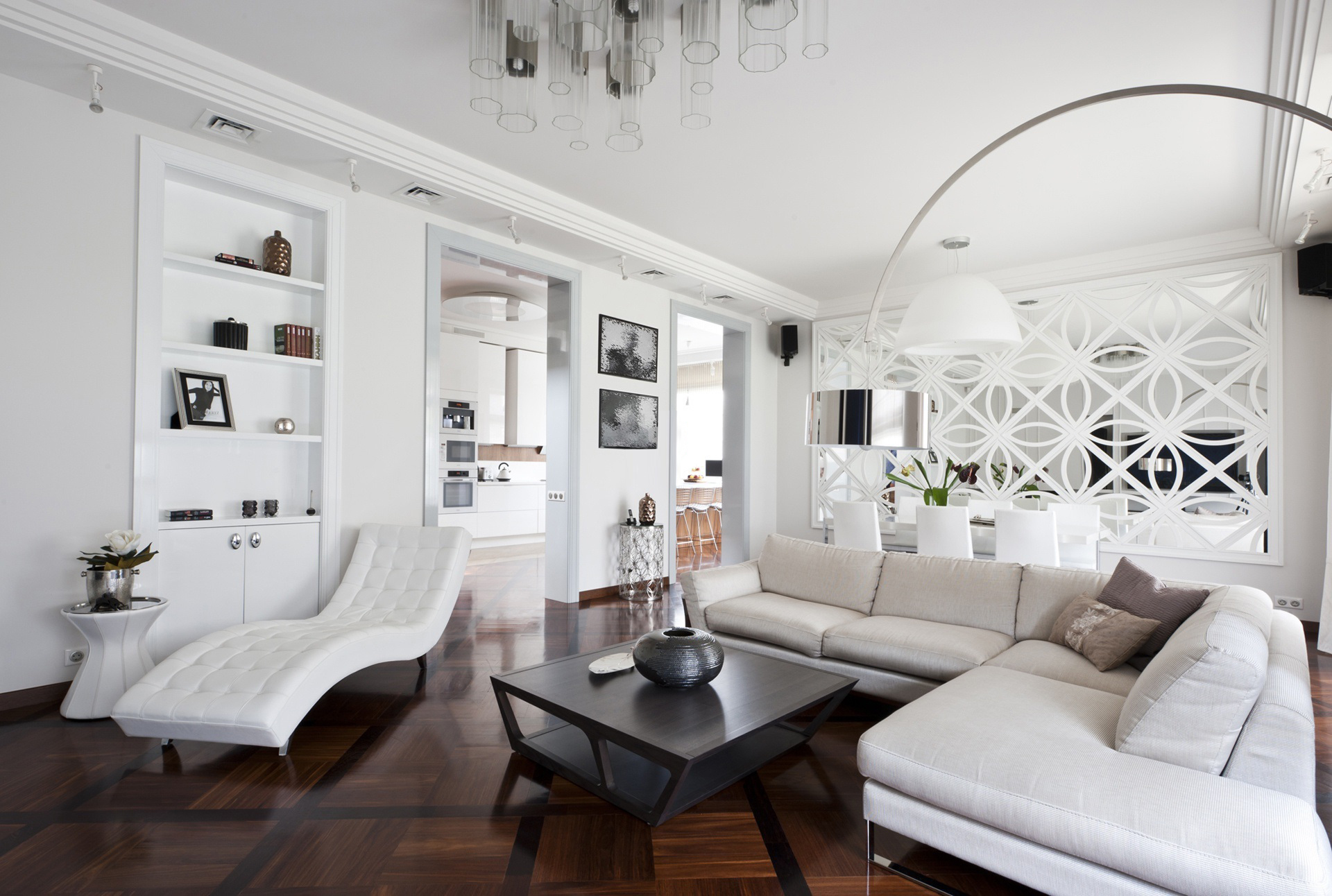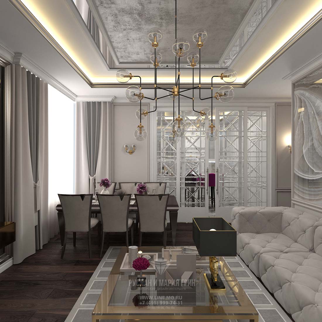 - mit einer schrägen Perspektive können Sie die Türöffnung zwischen benachbarten Räumen erweitern, indem Sie den Art-Deco-Stil in Weiß, Sand, Milch und Schwarz ergänzen: Sie können den Flur zwischen Gast- und Essbereich durch ein Sofa und einen Bartisch auszeichnen.
