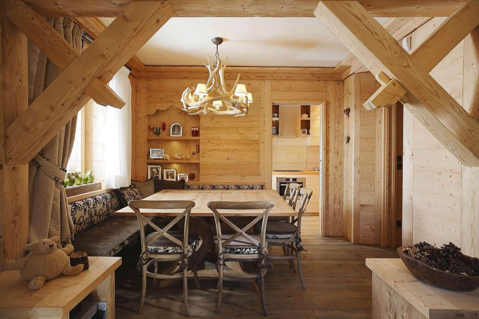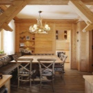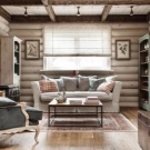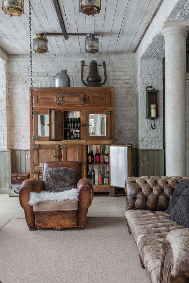 Brutal Style, der eine Mischung aus amerikanischen Land und typisch russischen Hütten ist, betont Kombination von natürlichen Materialien mit einem Minimum an Oberflächenbehandlung und Fortschritte im wissenschaftlichen Fortschritt. Dies sind Decken mit Balken, Holzfarbe von Wand- und Bodenverkleidung, die Kombination von lakonischen Lampen mit Dioden Punktlichtquellen.
