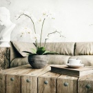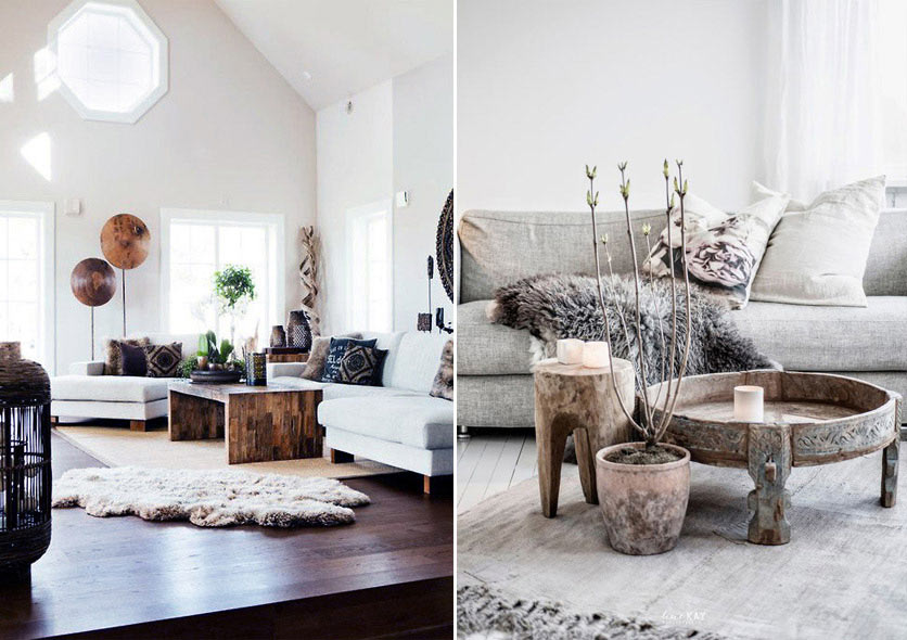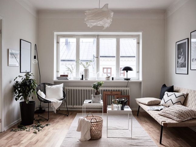 Große Fenster, weiche Teppiche, Kissen und Massivholzmöbel sind willkommen. Gleichzeitig fügen sich die beigefügten Tische, Bilder in Glasrahmen, Körbe, Korbwaren, Wohngrün und natürliche Möbelpolster perfekt in die Situation ein.