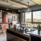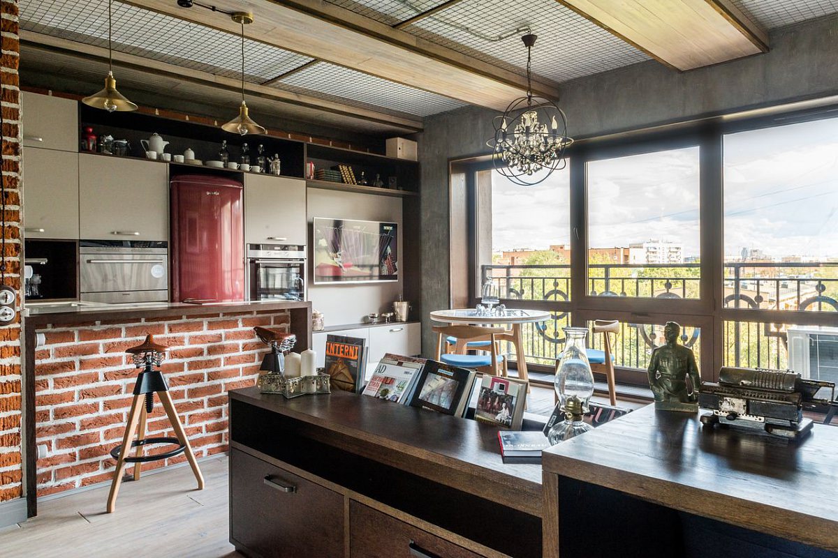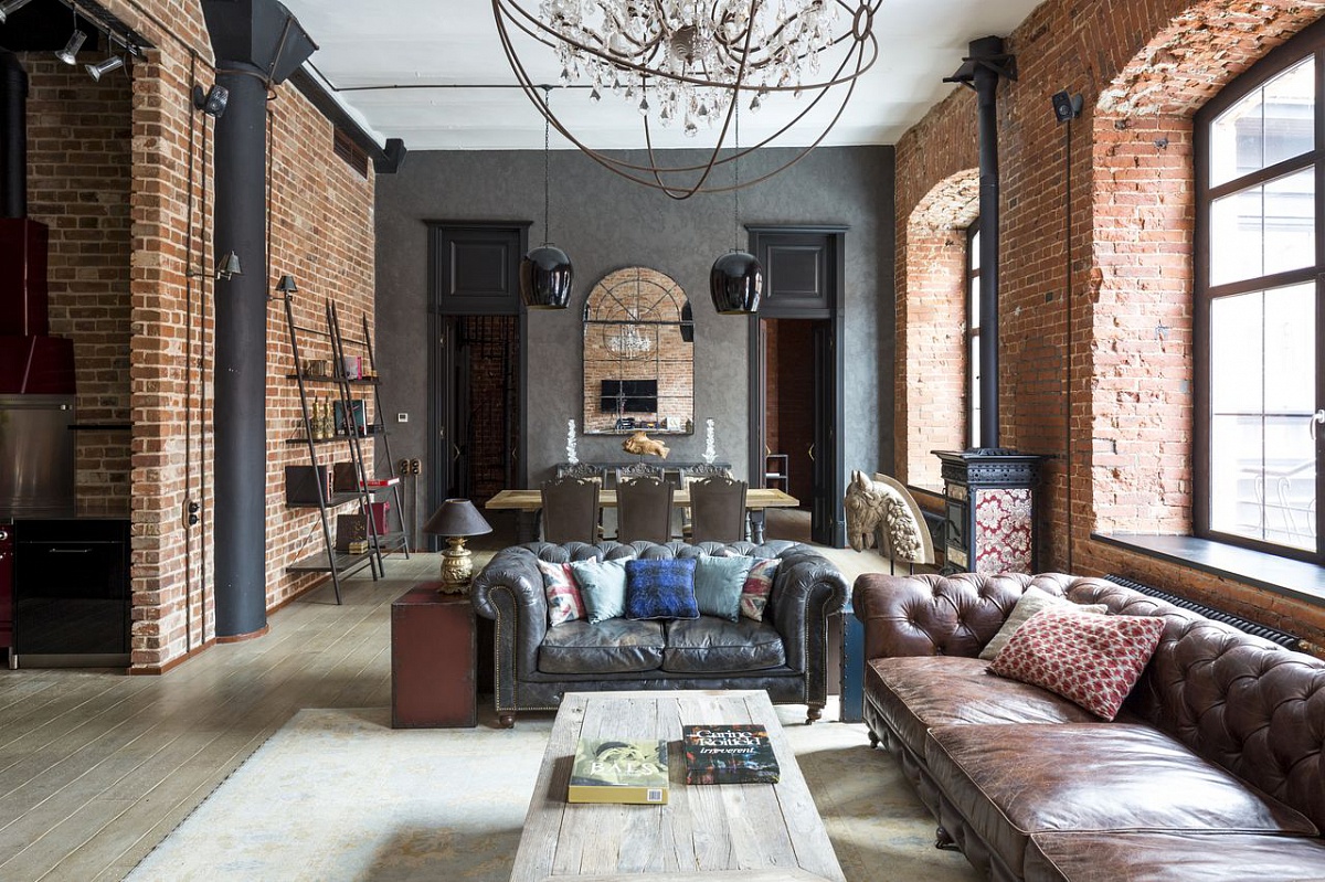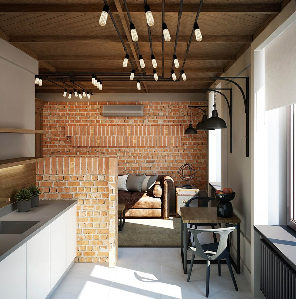 Das Dekor des Stils ist die Elemente der Kommunikation (Rohre), Bilder an der Wand und kreative Lampen (zum Beispiel in Form einer Pfeife mit offenen Lampen).
