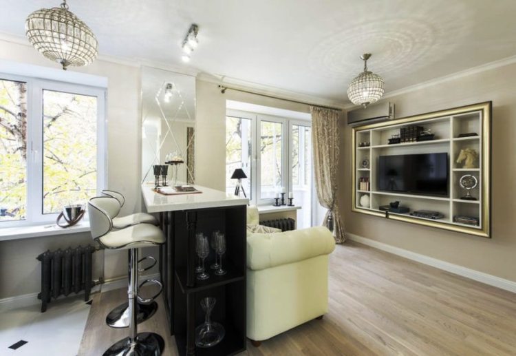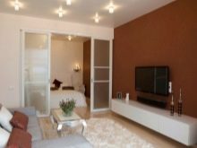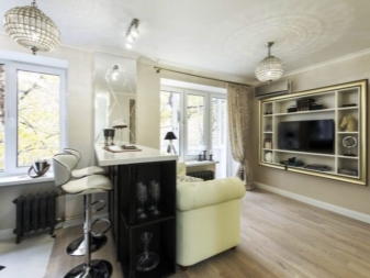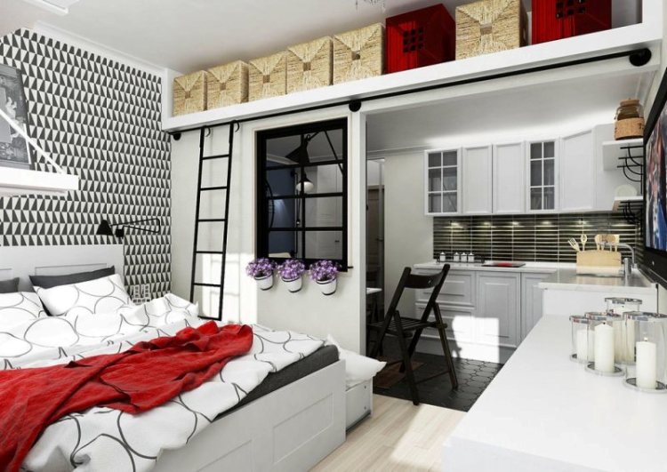 - in einer kleinen Wohnung können Sie eine der Wände teilweise entfernen, eine kleine Trennwand lassen, sie mit einem Fenster und einem Fenster unter einem kleinen hängenden Tisch dekorieren (während Sie das Schlafzimmer im Zimmer mit dem Hauptfenster lassen, setzen Sie ein Mini-Sofa in das zweite Zimmer, gegenüber der Wand) - Kochzone);
