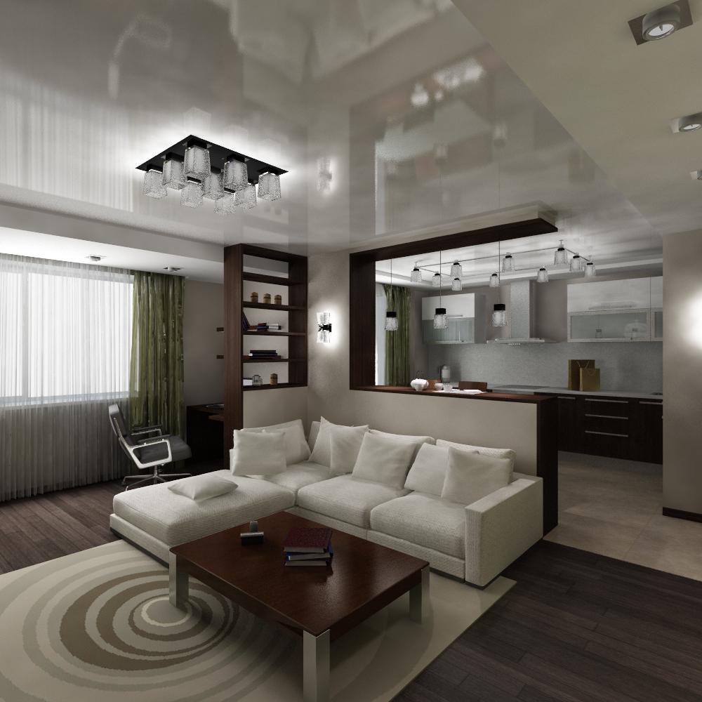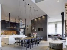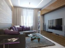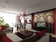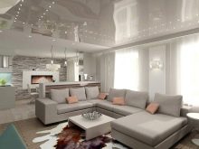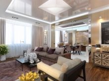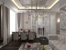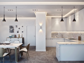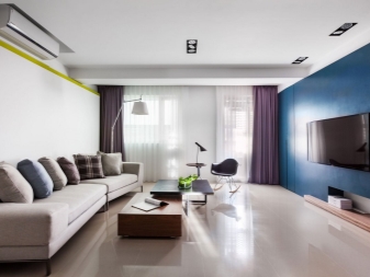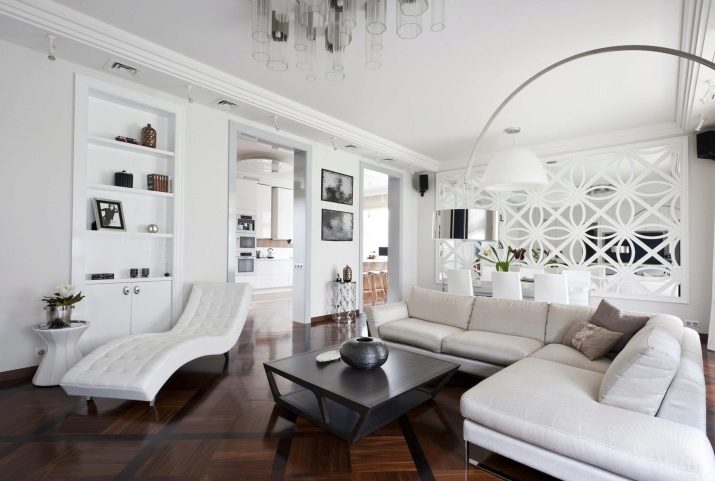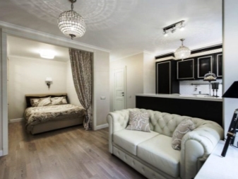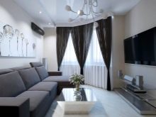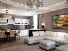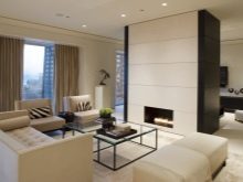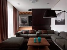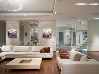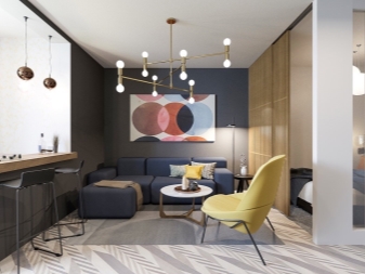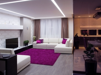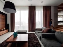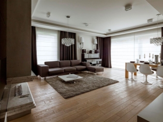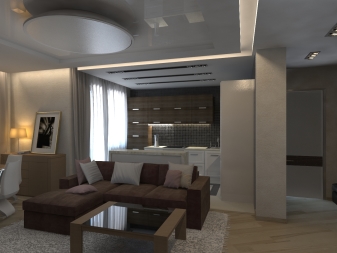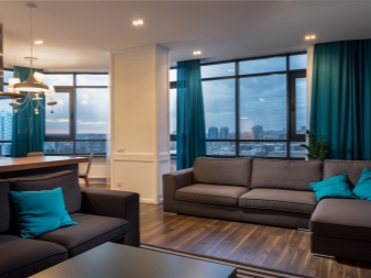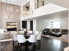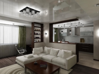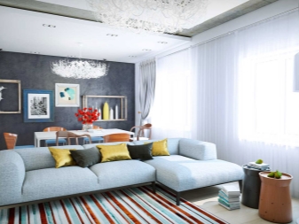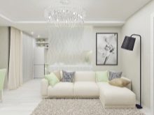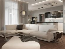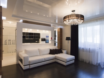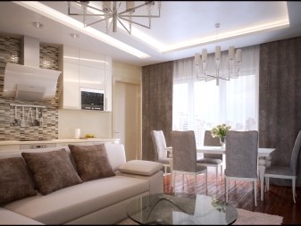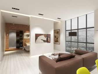 Heute haben solche Projekte mehrere Fenster, und Panoramafenster sind besonders relevant. Der Raum ist durch die verfügbaren Möbel geteilt, tatsächliche Lösungen sind die Deckenhöhe Unterschied, das Vorhandensein von Bögen zwischen verschiedenen funktionalen Bereichen der Wohnung, Mischen der Texturen der Wand und Bodenflächen und kontrastierenden Übergängen von Farbtönen.
