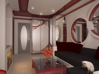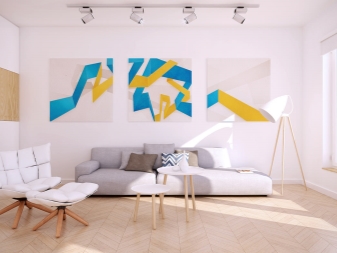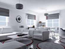 Sie können Räume mit Garderoben, eingebauten Speichersystemen ausstatten, mit Tischen, Büchern, Möbeln mit Glasfassaden dekorieren. Der Hauptfaktor der Stilistik ist gleichzeitig die Lichtfülle, die durch Decken- und Wandlampen abstrakter Formen wie Wäscheklammern und Stehlampen erreicht wird.