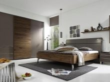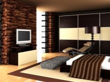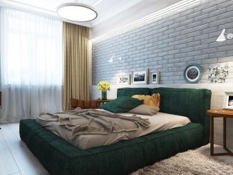 Der intime Raum der Wohnung wird hauptsächlich in sanften und gedämpften Tönen ausgeführt. Seine moderne Anordnung beinhaltet die Zuweisung von Schlafraum durch eine mehrstöckige Wand am Kopf, die Anwesenheit eines bequemen Einbauschranks mit einer Spiegelfassade auf die Höhe der Wand.