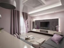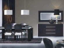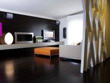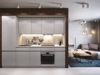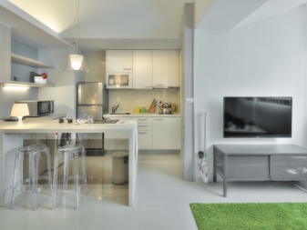 Die Holzmöbel mit Lederbezug sind inakzeptabel. Der Boden ist mit Fliesen, Linoleum und Laminat dekoriert, Gips wird für die Wände oder Wandteppiche mit einem geometrischen Druck verwendet. Die Decke sollte mehrere Ebenen haben, Möbel - Budget, Ergonomie gehorchen. Die Einrichtung solcher Räume ist Haushaltsgeräte, die Haupttöne sind neutrale Farbtöne mit hellen Kontrasten (Beige + Grün, Hellgrau + Wein).