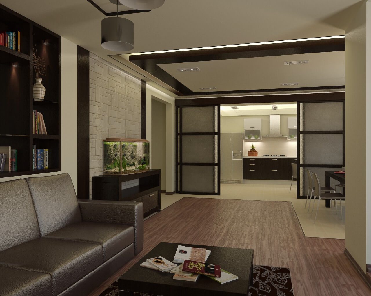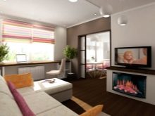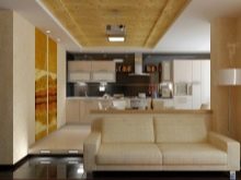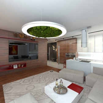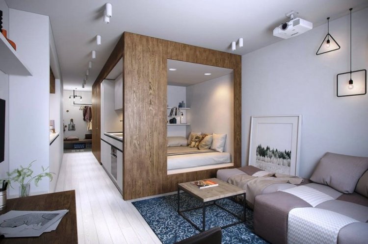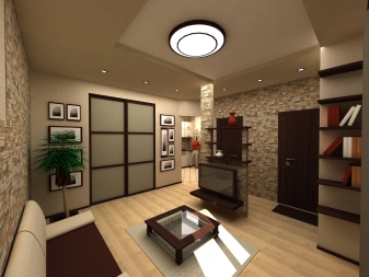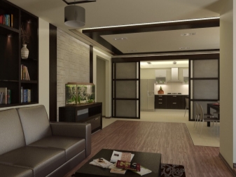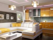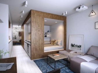 - eine ungewöhnliche Designoption ermöglicht die Kombination eines Wohnzimmers mit einem Flur oder einer angrenzenden Küche: in der Mitte des Raumes, Raum für freie Passage lassen,Es ist möglich, einen funktionalen Würfel mit einem kompakten Schlafbereich und einem Kochplatz in verschiedenen Richtungen anzuordnen, der den Gäste- und den Eingangsbereich durch den Würfel selbst begrenzt;
