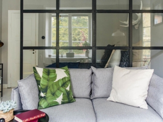 Schließt massive Möbel von Möbeln aus: Sie verbergen die Sichtbarkeit von Raum. Verkleiden Sie gepolsterte Möbel mit einem Plaid oder stilvolle Umhänge und dekorative Kissen: Dies gibt jedem Stil ein komplettes Aussehen. Gleichzeitig sollte die Farbe der Kissen und ihrer Textur unterschiedlich sein (Sie können eine Mischung aus Textil- und gestrickten Kissen einer quadratischen, rechteckigen Form in Form von Rollen wählen).