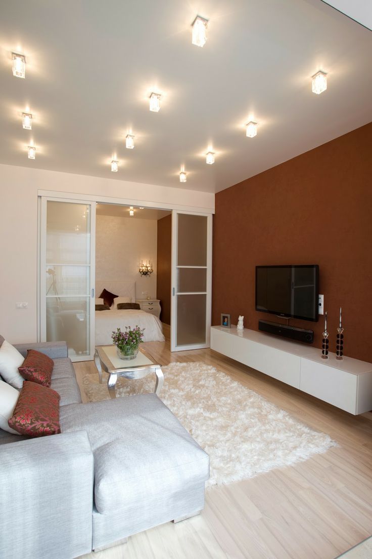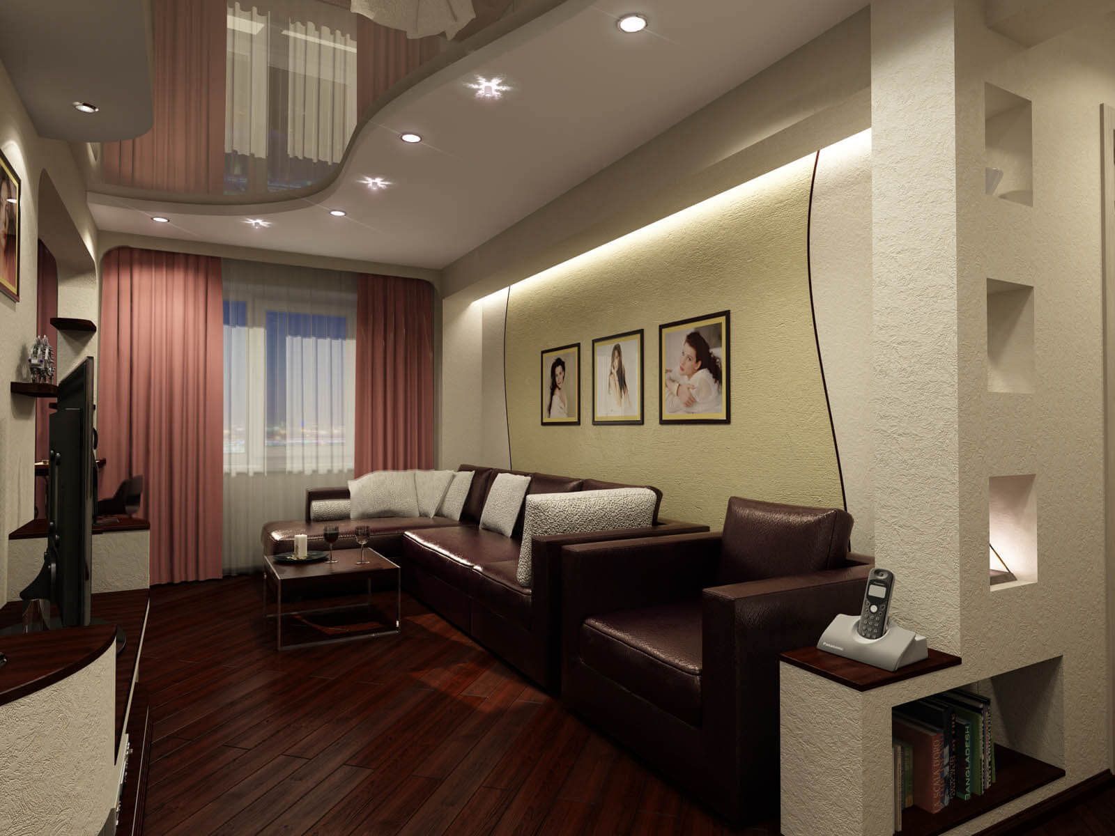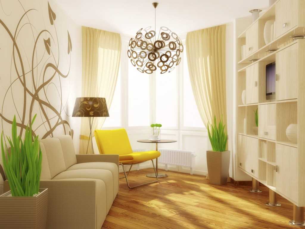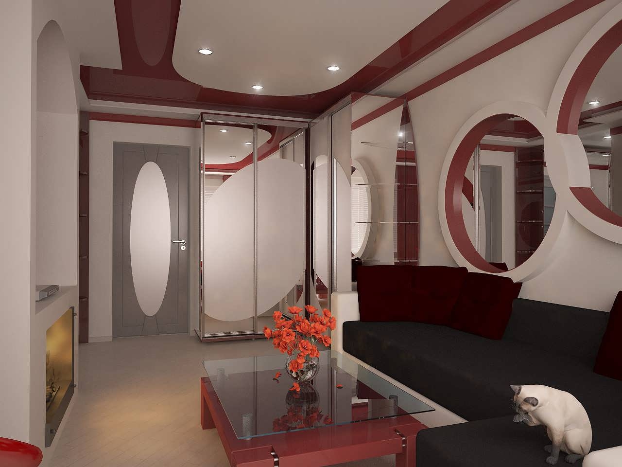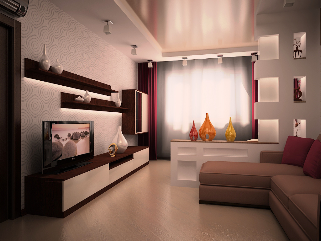 Stylisten betonen: Dass die Gestaltung des Raumes ausdrucksstark war, sollte keine Fülle von Vielfalt und Details der Situation seinJe kleiner der Raum ist, desto kleiner ist das Möbelset und desto größer ist seine Funktionalität (Verwandlung und kompakte Größe sind willkommen). Je größer die Fläche, desto größer die Textur der Wand- und Bodenbeläge und desto heller der Innenraum.