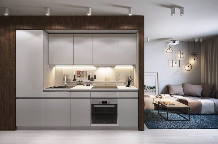 - um kompakte Küche zu machen, kombinieren Sie es mit Essen, Sie können,Verwenden Sie den eingebauten Tisch und das Minimum an Möbeln, während der Esstisch während des Kochens verwendet werden kann (für Harmonie, verwenden Sie eine Kombination aus weißen, hellgrauen und braunen Farbtönen);
