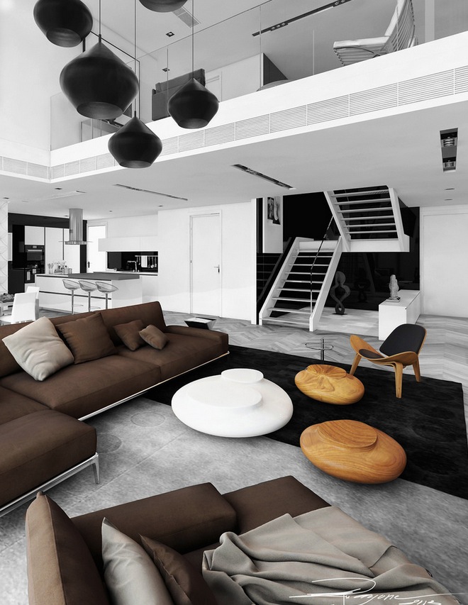 Dieser Raum ist offen. Diese Wohnung ist anders im Raum, während in ihr alle Räume zu einem kombiniert werden, obwohl manchmal das Layout für das Vorhandensein von Trennwänden und Säulen sorgt. Dieses Projekt ist nichts anderes als eine Wohnung, die keine isolierten Räume hat, mit Ausnahme des Badezimmers und des Badezimmers.