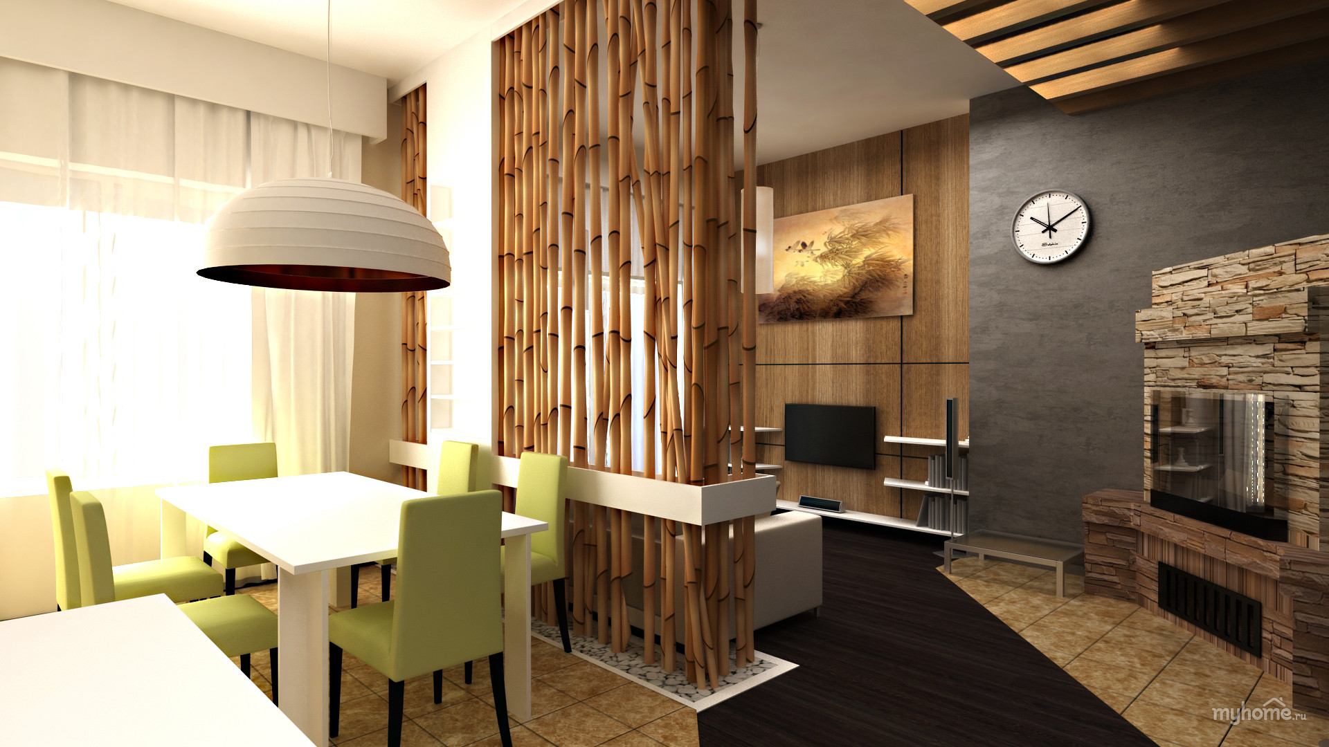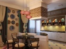 Für das Interieur im chinesischen und japanischen Stil verwenden sie ein Minimum an Möbeln: ein Bett-Podium, ein Paar Schränke, die vor neugierigen Blicken verborgen sind, eine einfache Kücheneinheit, Schiebetüren und Vorhangpaneele an den Fenstern.