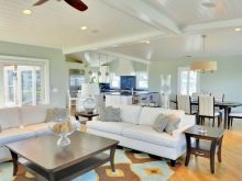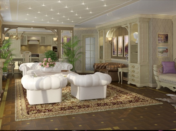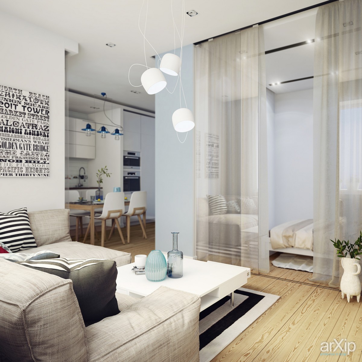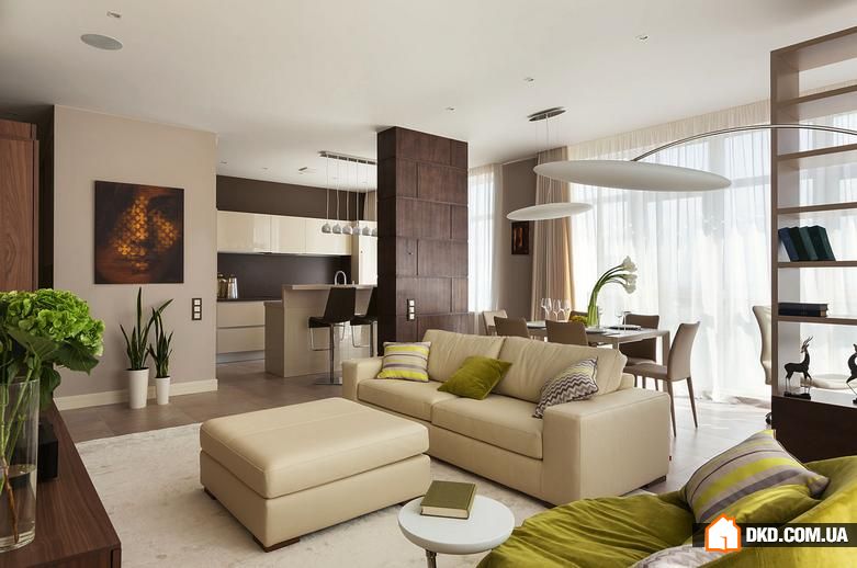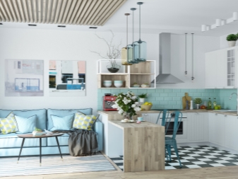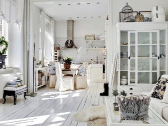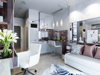 Hier herrschen helle Töne vor, wie Weiß, Beige. Das Design ist einfach genug für die Wahrnehmung.Diese Design-Studio-Wohnung ist in der Lage, auch einen düsteren Raum mit wenig Tageslicht zu erfrischen. Und doch, um ein solches Interieur vor einem langweiligen und krankenhausähnlichen Aussehen zu bewahren, empfehlen Designer, helle Akzente zu setzen. Zum Beispiel eine Schürze in der Küche in Form von Mauerwerk oder ein helles Sofa.