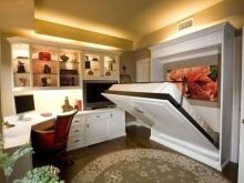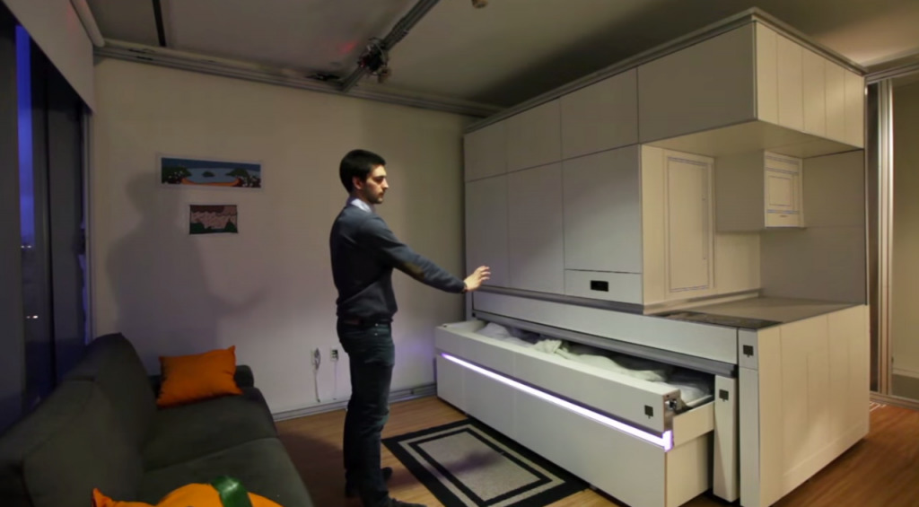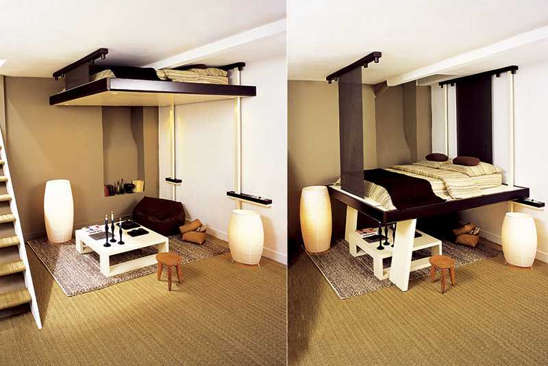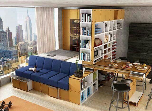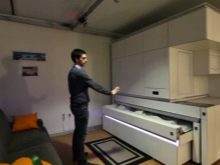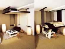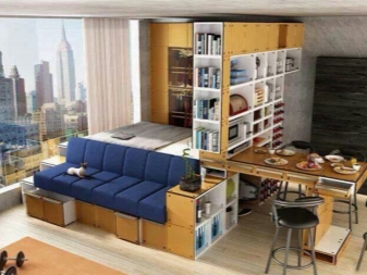 Für Studio-Wohnungen oft Möbel-Transformator, der mehrere Funktionen auf einmal kombiniert. Der Couchtisch kann leicht zu einem vollwertigen Schreibtisch oder einem Platz für ein Fest werden. Das Sofa wird in ein komplettes Doppelbett umgewandelt, das Küchenset ist mit Schiebetüren geschlossen.