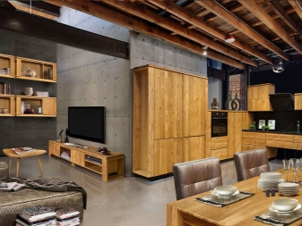 An der Decke in dieser stilistischen Entscheidung verwendet oft Balken. Sie können entweder aus Metall sein oder unter dem Baum gemacht werden, ihre Farbe sollte mit dem Bodenbelag identisch sein. Sie können die vorhandenen Merkmale der Decke verwenden oder sie aus Trockenbau bauen.
